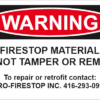 Firestop signs identify where firestop materials have been applied and prevent the removal of the material. You can either order our standard OSHA Firestop Warning Sign or you can order a custom sign with the installing contractor’s information on it.